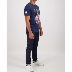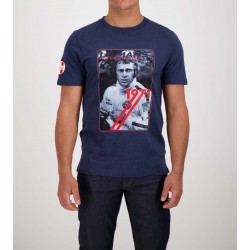 T-Shirt pour homme Steve McQueen Le Mans Portrait Steve McQueen avec inscription 1971 Le Mans Steve McQueen à l'avant Badge Le Mans Steve McQueen sur la manche droite Couleur Bleu Foncé Matière 100% Coton