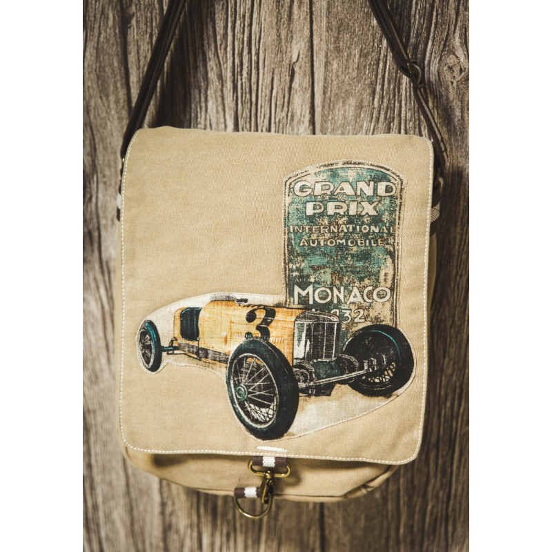 Sacoche en toile canvas, bandoulière ajustable, poche arrière avec fermeture éclair, poche étui intérieur avec fermeture éclair. Image vintage en tissu appliqué. Dimension: 34 x 29 x 10 cm.