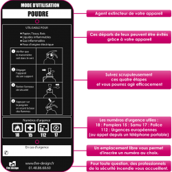 Livré avec support de fixation. Garantie Fire Design. Produit garanti 10 ans. Une recharge gratuite en cas de départ de feu. Une vérification offerte.Homologué CE. Agent d'extinction : Poudre. Agit sur tout type de départ de feu. Spécial véhicule et habitation.