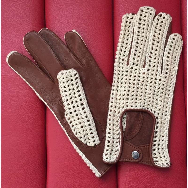 Gants 100 % cuir chevreau coloris marron et dessus de main en crochet de coton crème.