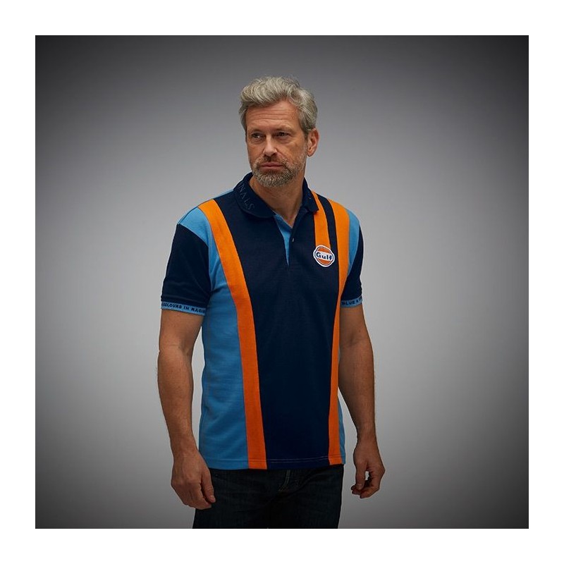 Le légendaire polo racing de GPO commémore le cinquantenaire de la victoire de la Porsche 917 sous les couleurs de Gulf, aux 24-Heures du Mans 1970. Le « #50 » célèbre cet anniversaire sur la manche et la broderie Michael Delaney sur la poitrine droite rend hommage au film Le Mans avec Steve McQueen. La coupe est généreuse. En cas de doute, vous pouvez commander une taille inférieure ! 65 % coton, 35 % polyester