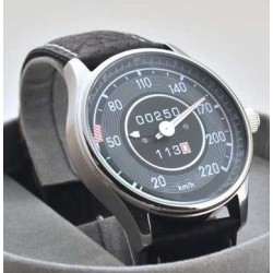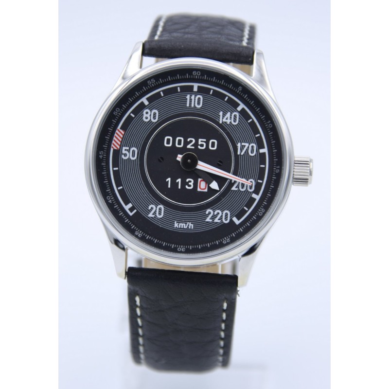 Avec fonds de compteur de vitesse de MERCEDES 250 SL. Bracelet en cuir noir avec coutures blanche. Mécanisme à quartz CITIZEN. L'indicateur de vitesses est utilisé comme aiguille des minutes. Une discrète aiguille noir et blanche indique les heures. Chiffres fluorescents. Étanche à 10m. Vissé par le bas. Livré dans un box en cuir. Diamètre du cadran: 40.
