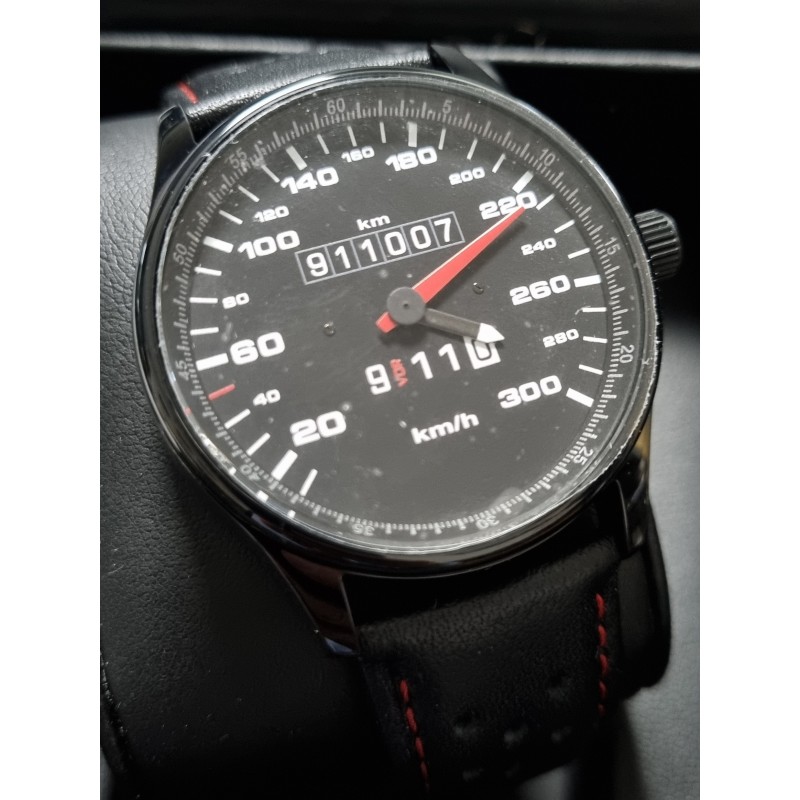 Bracelet en cuir noir avec coutures blanche, cadre métal noir. Mécanisme à quartz CITIZEN. L'indicateur de vitesses est utilisé comme aiguille des minutes. Une discrète aiguille noir et blanche indique les heures. Chiffres fluorescents. Etanche à 10m. Vissé par le bas. Livré dans un box en cuir. Diamètre du cadran: 40.