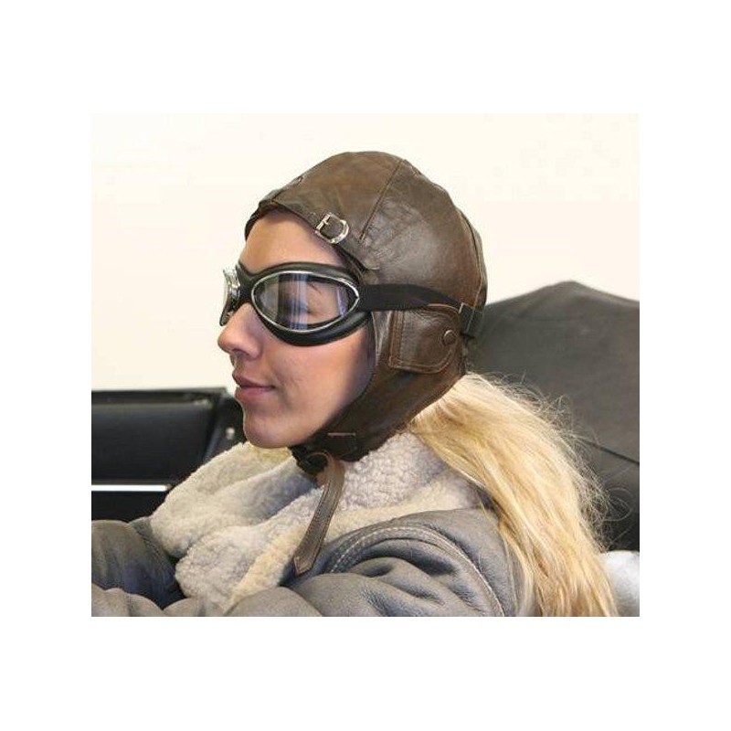Serre tête pilote type aviateur, en cuir bœuf marron vieilli, doublé coton, modèle 1935. Sangle réglable sous menton pour fermer et sur le dessus de la tête pour ajuster.