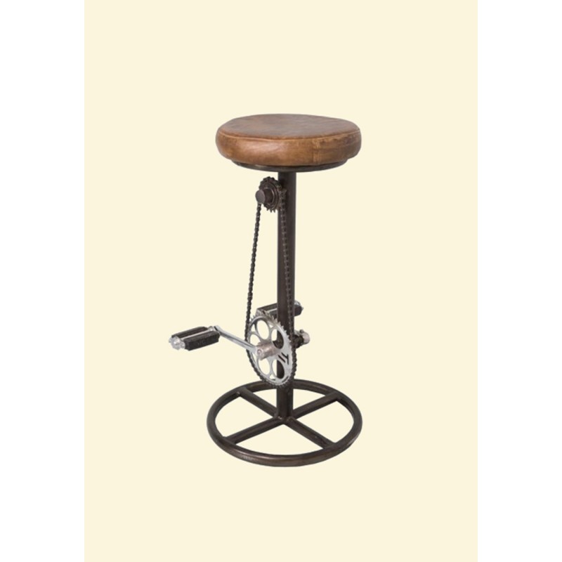 Tabouret de bar vélo en métal noir vieilli et assise cuir avec un mécanisme de vélo en guise de repose-pieds (le mécanisme ne fonctionne pas).
