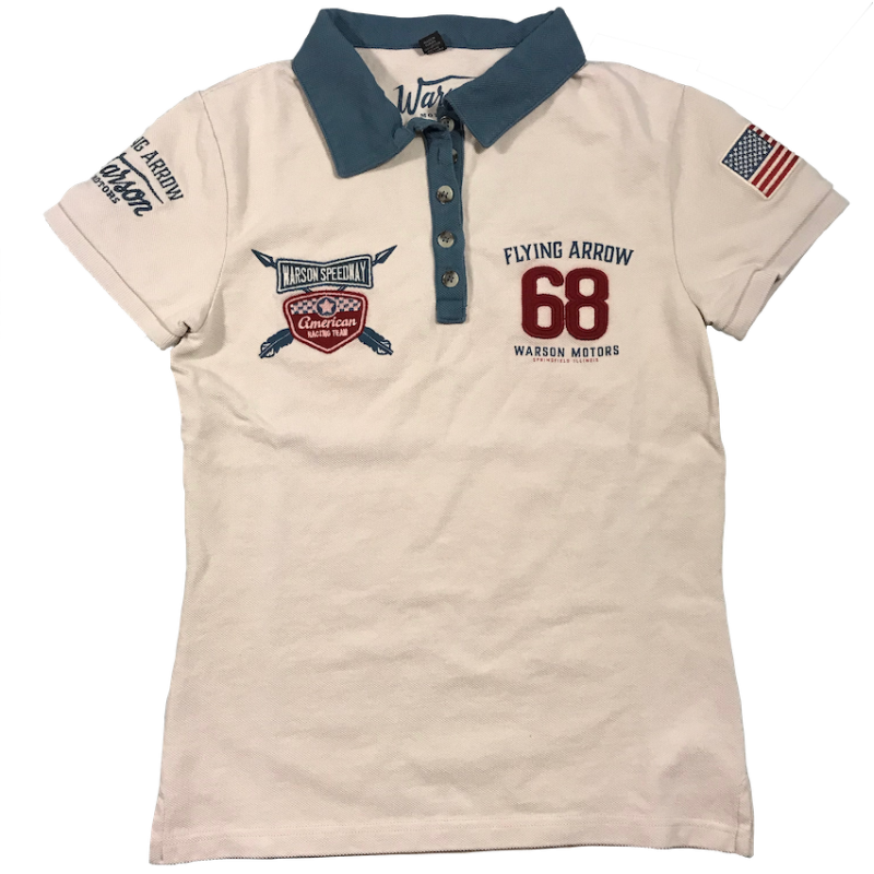 Polo Warson femme blanc col bleu, Flying Arrow, 100 % coton.