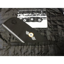 Veste noire à col anti-remous. La matière en polyester fait également effet de coupe-vent. Fermeture zip aux deux poches poitrines, deux poches latérales, bas de manches et pour fermer la veste. Doublure matelassée avec deux poches poitrine, poche de rangement pour le col amovible et une photo noir/blanc vintage dans le dos. Finition des bordures avec liséré damier et bande tricolore en bas de la veste à droite.3 écussons. Numéro de course aléatoire.